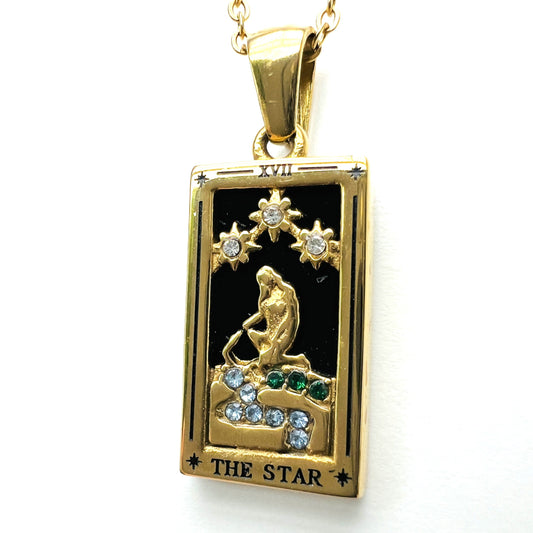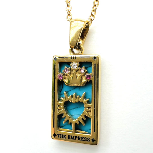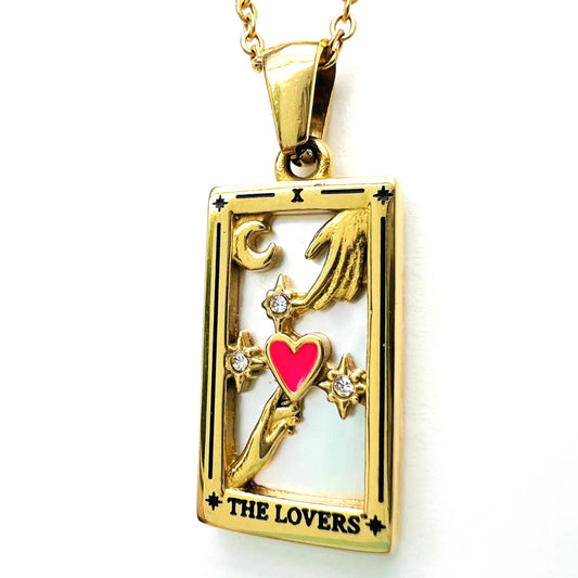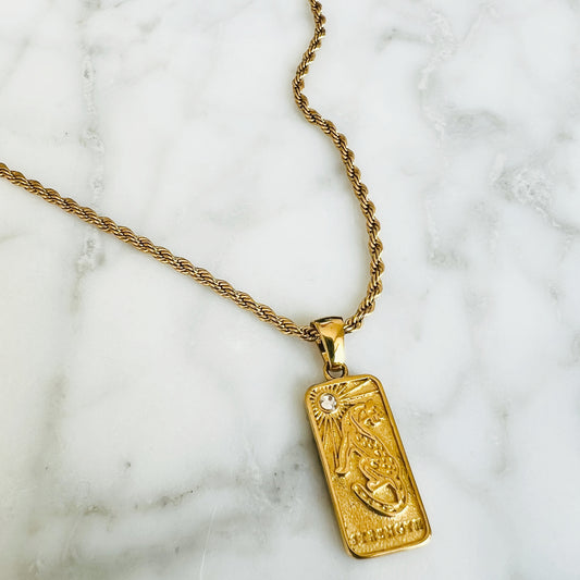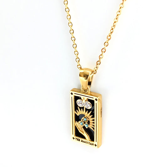 Chaque bijou est en acier inoxydable plaqué or et s'inspire des arcanes majeurs du Tarot de Marseille, offrant une symbolique unique à son porteur.