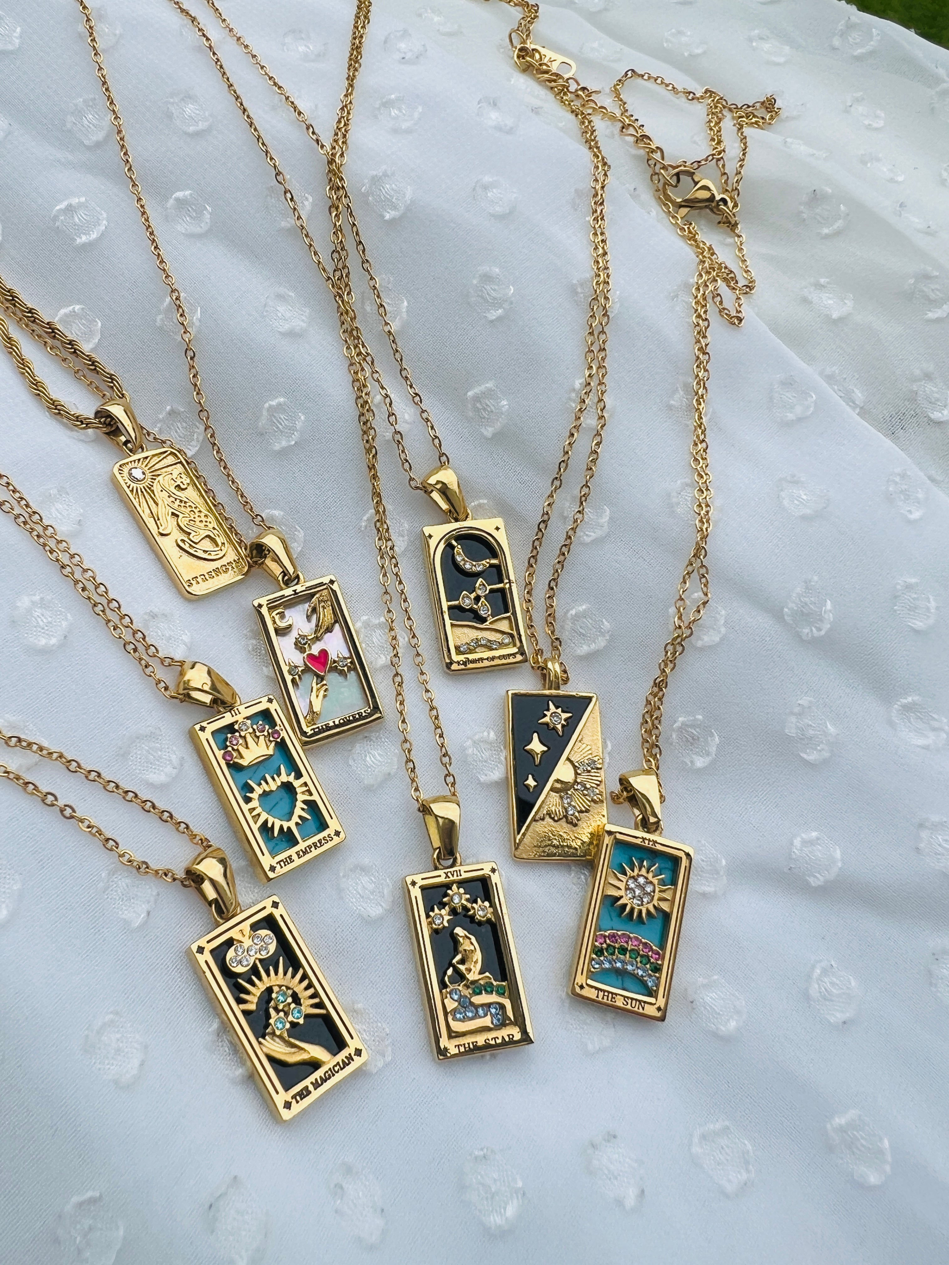 Chaque bijou est en acier inoxydable plaqué or et s'inspire des arcanes majeurs du Tarot de Marseille, offrant une symbolique unique à son porteur.
